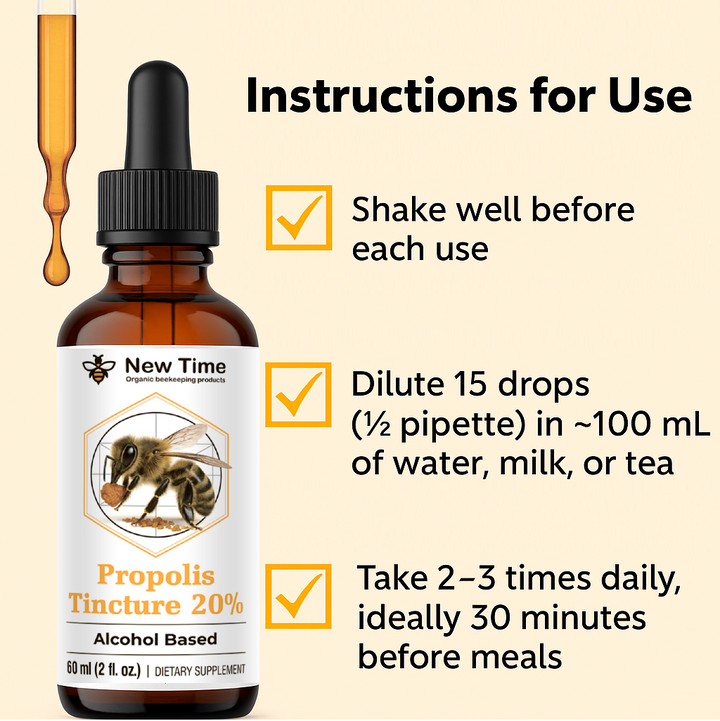 A concentrated 20% bee propolis liquid extract made with 70% food-grade ethyl alcohol for effective extraction and stable shelf life. Crafted from raw propolis sourced from carefully managed apiaries and bottled in an amber glass bottle to protect potency.